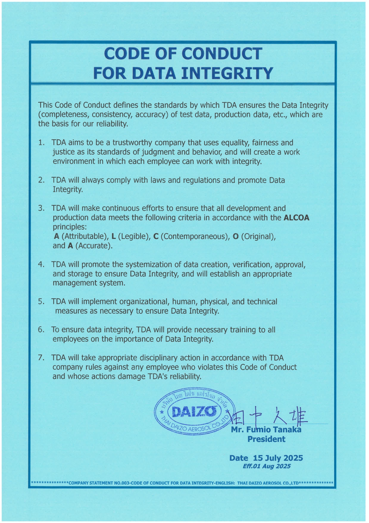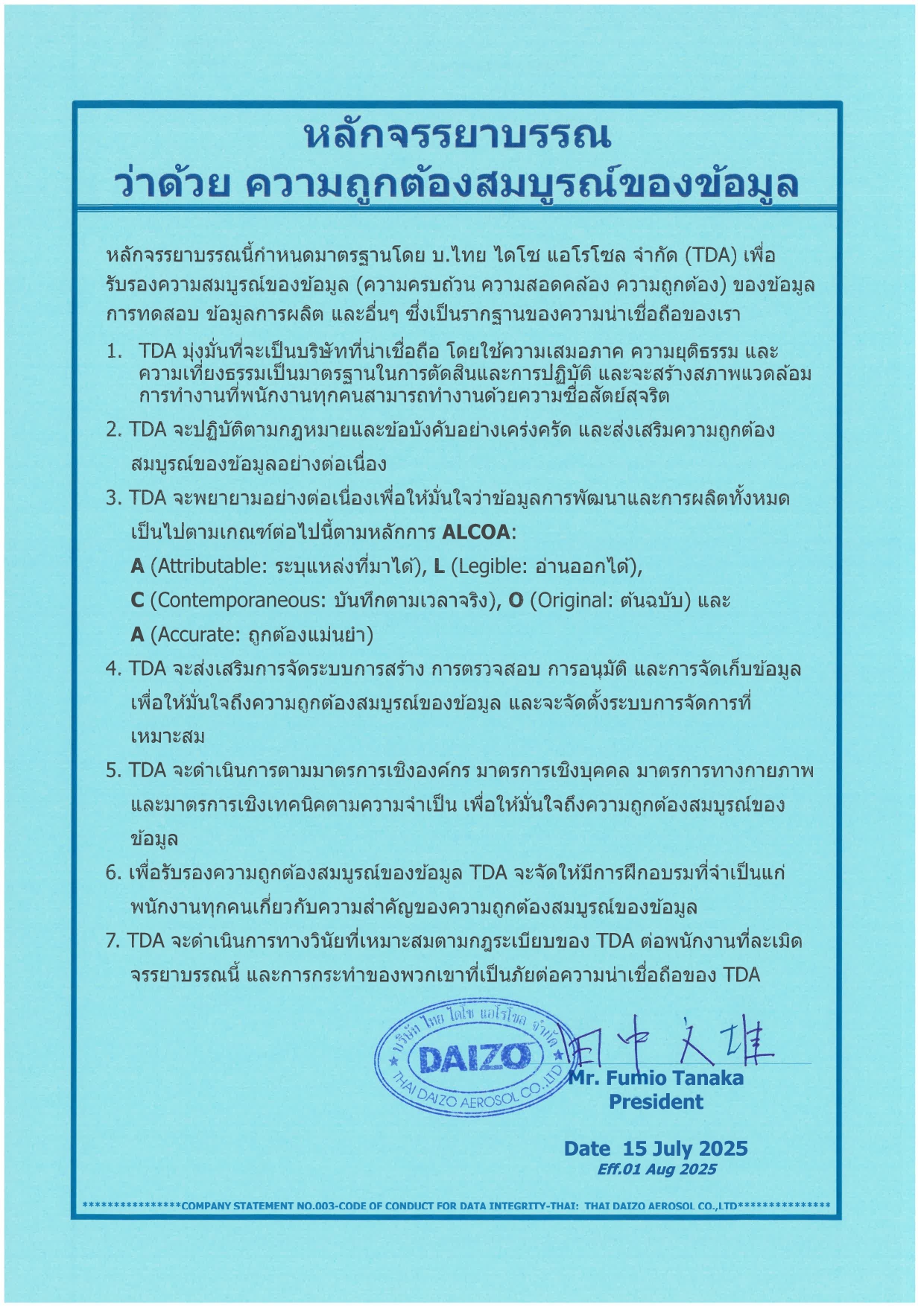 หลักจรรยาบรรณนี้กำหนดมาตรฐานโดย บ.ไทย ไดโซ แอโรโซล จำกัด (TDA) เพื่อรับรองความสมบูรณ์ของข้อมูล (ความครบถ้วน ความสอดคล้อง ความถูกต้อง) ของข้อมูลการทดสอบ ข้อมูลการผลิต และอื่นๆ ซึ่งเป็นรากฐานของความน่าเชื่อถือของเรา